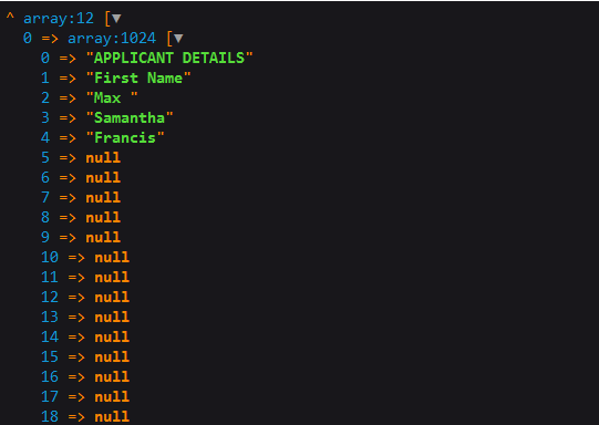 With the spreadsheet loaded, we can finally start going through the rows and columns. First off, we must get the contents of the header, which will be the indexes of the array when we get the data from each column after this. If there are any rows before the heading row, it will be removed from the array since it will interfere with later processes extracting the values from each following columns.